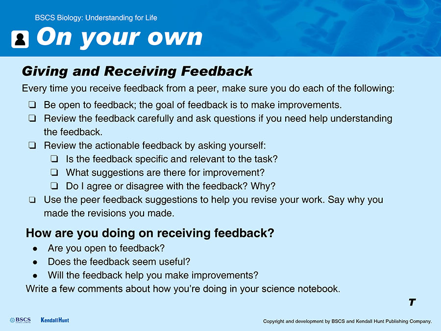 Display Slide T. Have students return to their jigsaw groups and direct them to silently read through the sticky notes that were attached to their chart. Ask them to recall the purpose of receiving feedback, referring to the handout as necessary, and to assess how they are doing individually at receiving feedback on the representations from their chart. Have them write a sentence or two about their reactions in their science notebooks.